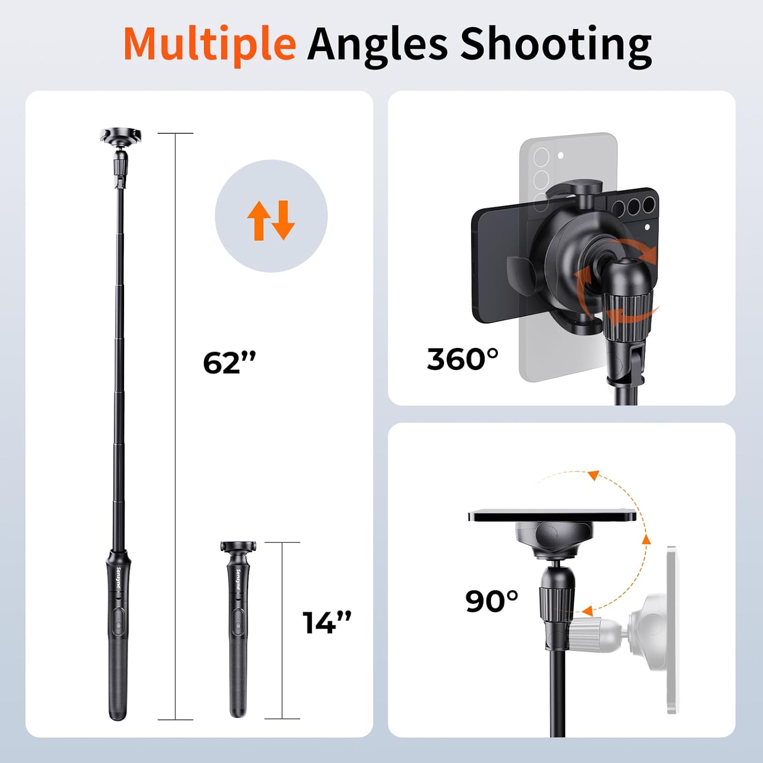 Sensyne 62” Magstick Selfie Stick Tripod, All-in-One Phone Tripod with Magnetic Phone Holder and Detachable Wireless Remote, Compatible with MagSafe, All Cell Phones